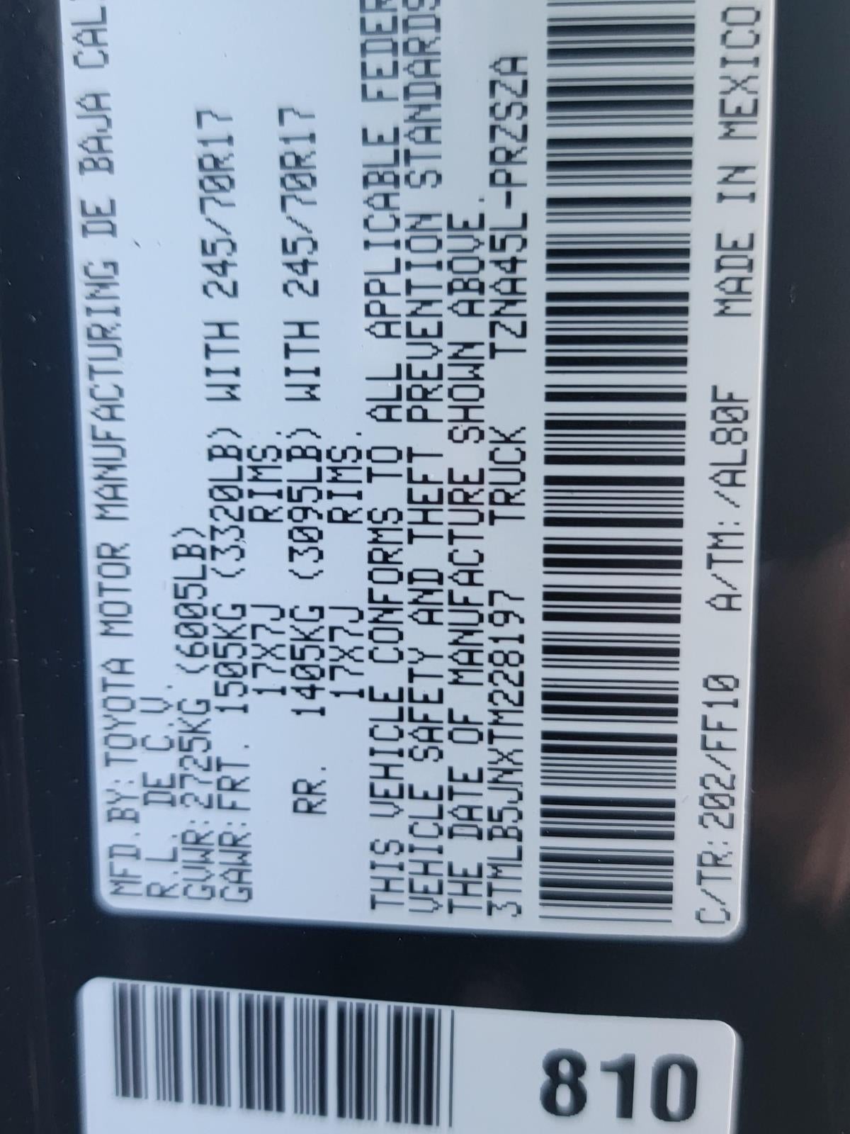 - Vehicle Name: Toyota Tacoma 4WD