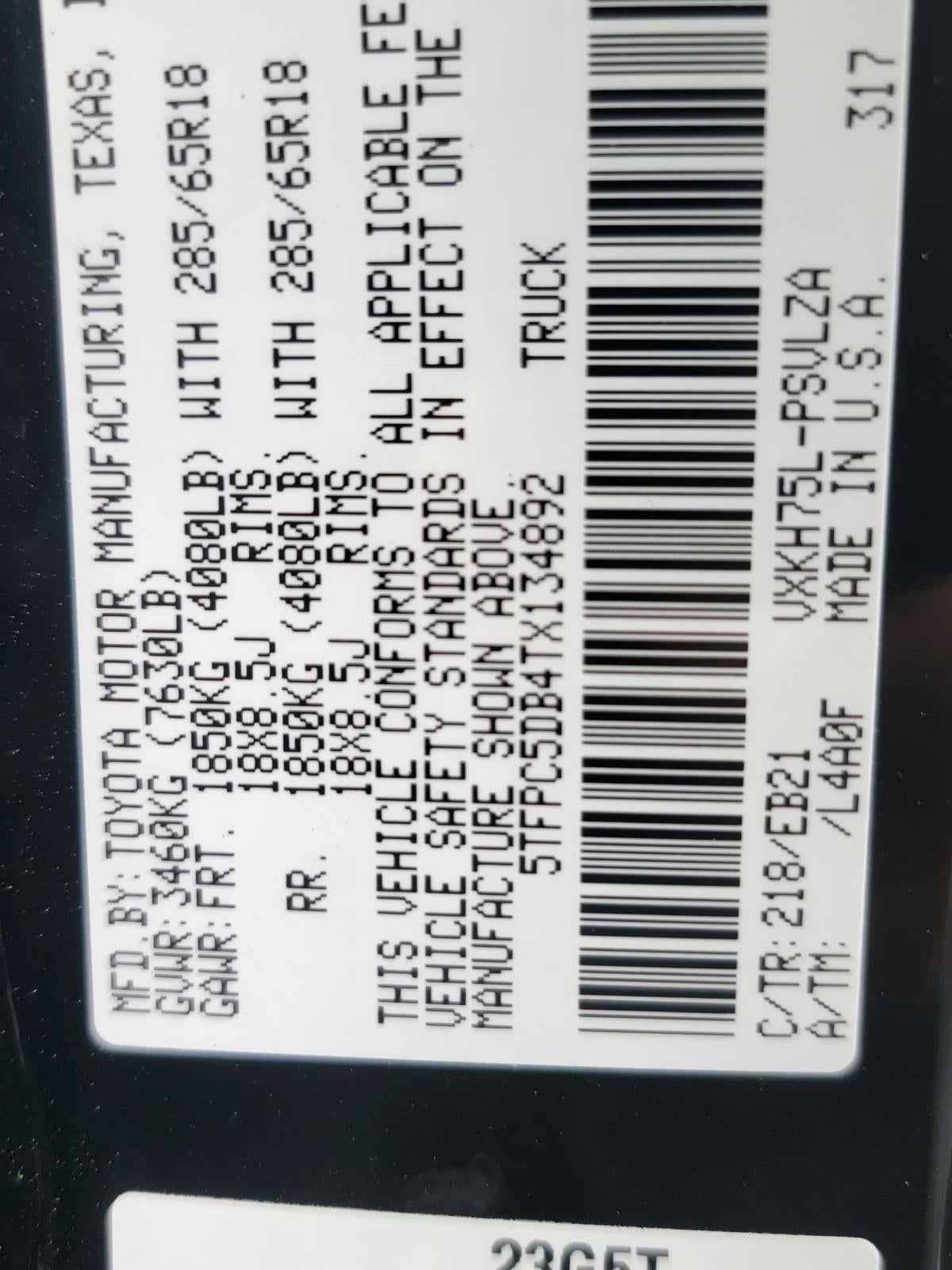 - Front Tire Size: P285/65HR18